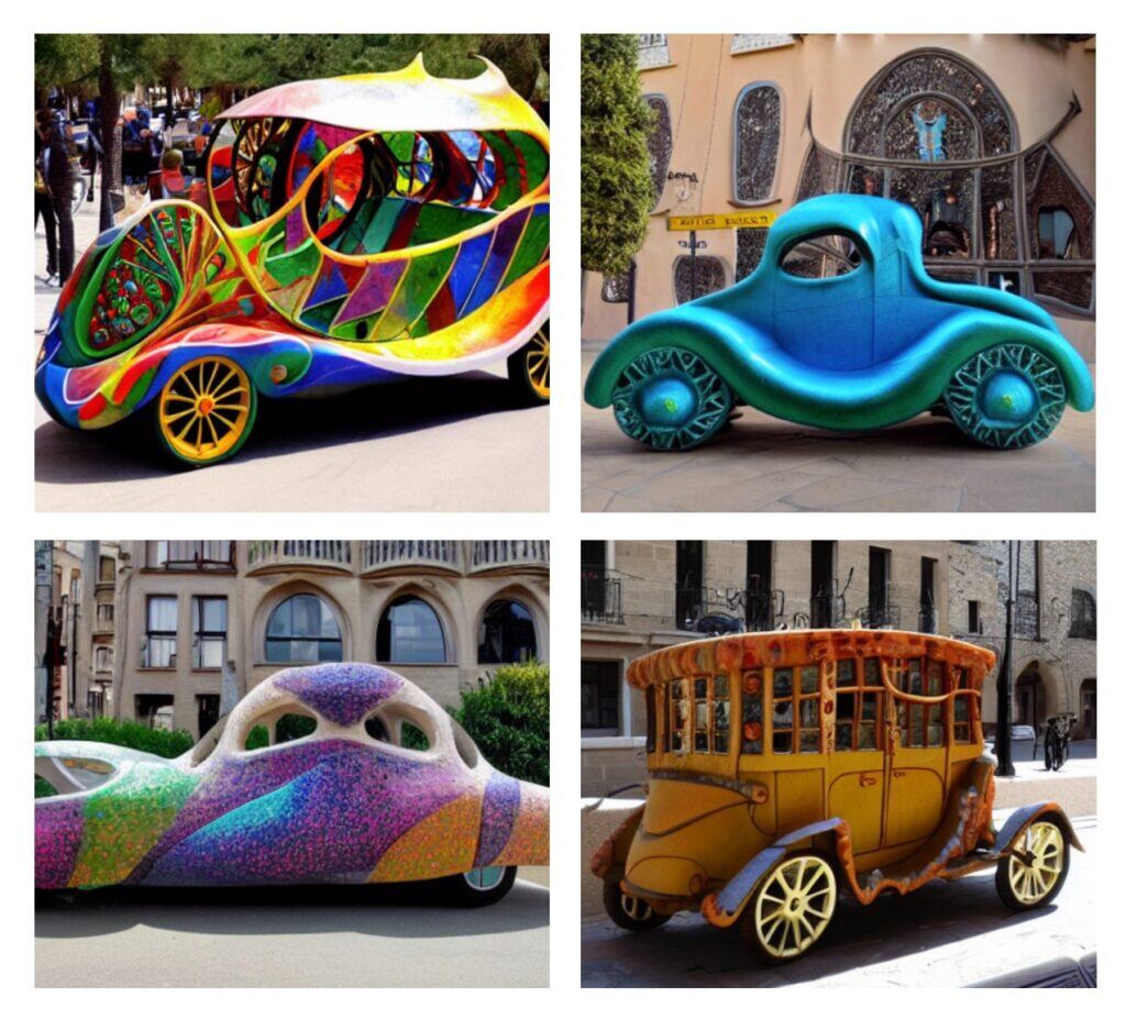 A few examples. I asked one called Stable Diffusion if it would create me some “Gaudí cars.” There was no way for me to explain what I meant by Gaudí cars, but what I was thinking was to try to get some cars that looked as if they’d been designed by the Spanish architect Antoni Gaudí. And I have to say, the results look pretty much exactly like what I’d imagine a car designed by Gaudí would be like: