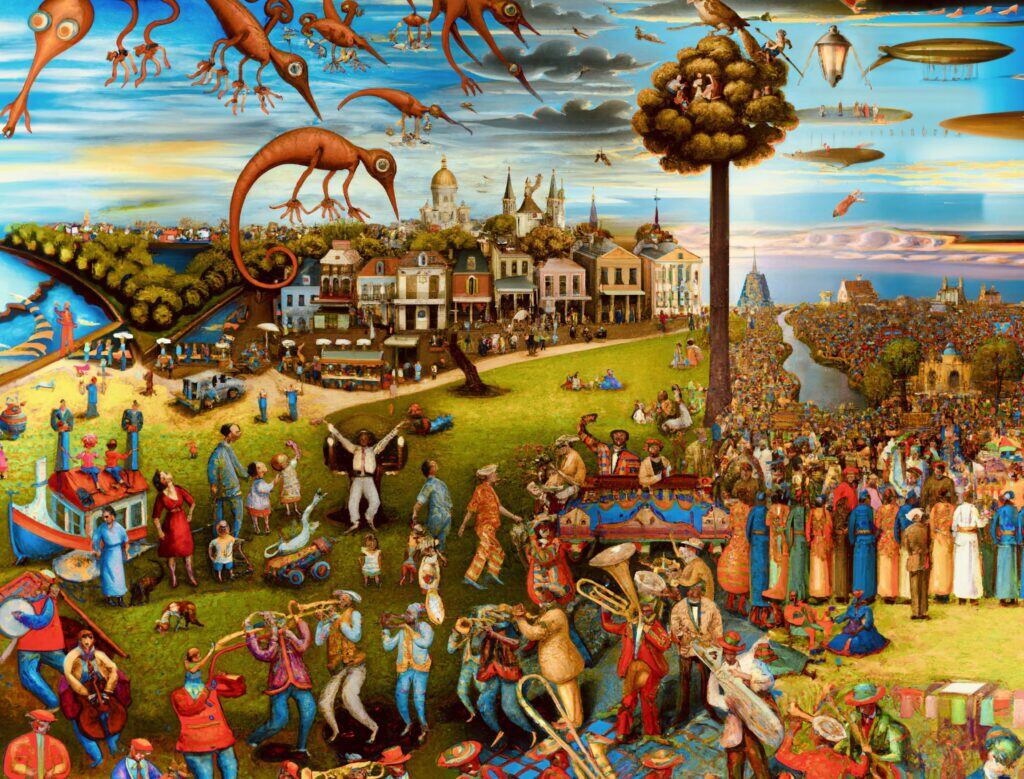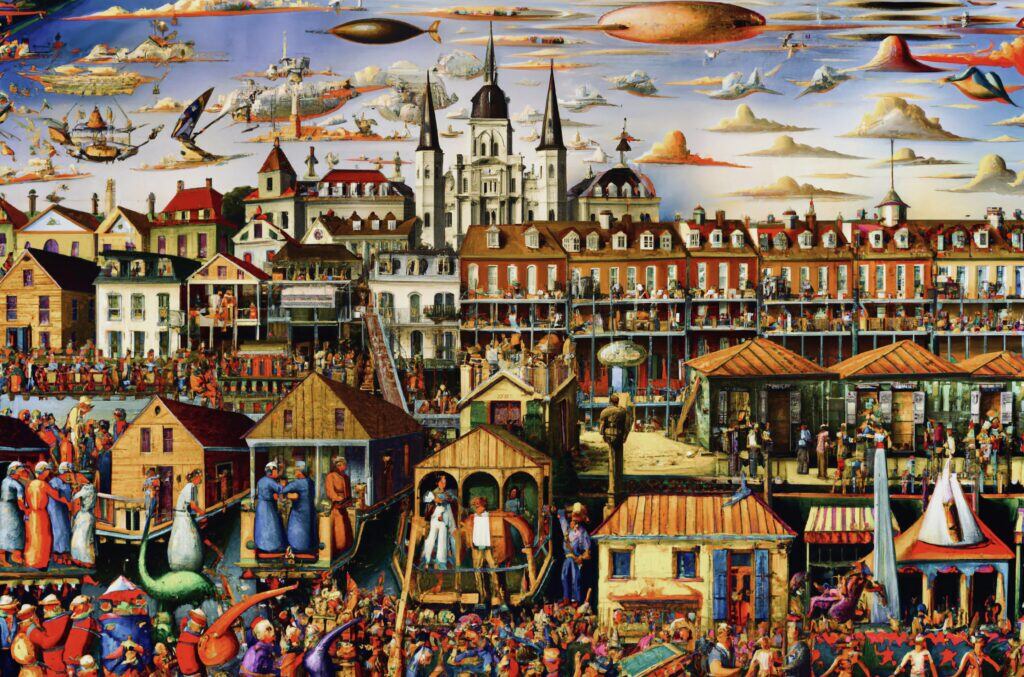 Ah, but I was insatiable once I got started with this thing. Could I really have any artist from all of history paint anything I could dream of? (Or rather, an algorithmic approximation of that artist, painting its own slightly bizarre interpretation of anything I could dream of.) I decided to really go wild and get an AI painting of New Orleans, in the style of Hieronymus Bosch: