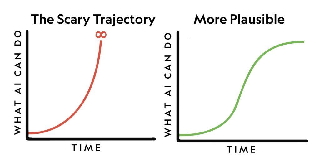 Skeptics argue, however, that what looks like infinite growth might be deceptive, and the real trajectory for various technologies might looks something more like this, where an impressive spurt of development is followed by a tapering off as the technology reaches its full potential: