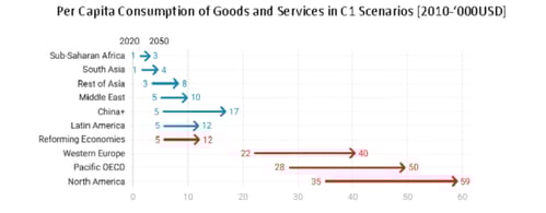 These models imagine a future in 2050 where no developing region has even caught up to today’s rich-nation living standards, and sub-Saharans merit just 4.6 percent of the consumption per capita of North Americans ($2,700 vs. $58,600). That’s three decades in which 14 times more resources per capita are used to add to rich-nation comforts than go to mitigating severe sub-Saharan poverty. All model metrics have similar diabolically disproportionate resource-hog skews (e.g., a North American in 2050 gets 8 times the energy of a sub-Saharan).