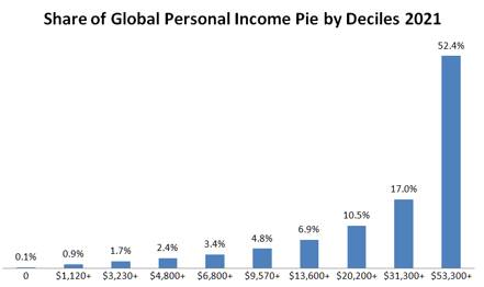 The World Inequality Lab (WIL) data charted below shows how the global pie is sliced by income deciles. Our de facto revealed priorities are crystal clear: the top decile greedily gobbles up more than half the whole pie (52 percent), the poorest half share only 8.5 percent, and the bottom decile secures only the slimmest of slivers (0.1 percent).