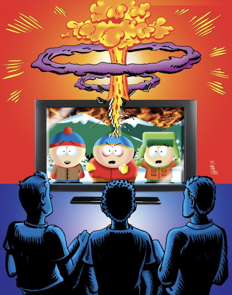 Wesley Morris wrote in 2018 in The New York Times that there has been a shift—almost an inversion—in the culture wars in the last few years. In the 1980s and 1990s, moralizers “tended to be white people from politics and the church” concerned about young people being exposed to single motherhood on Murphy Brown, Cyndi Lauper songs about masturbating, or a sexually active Jesus in Martin Scorsese’s The Last Temptation of Christ. “The culture wars back then always seemed to be about keeping culture from kids. Now the moral panic appears to flow in the opposite direction. The moralizers are young people, not their parents.” He’s empathetic to this generational shift, feels it partly himself, but laments how the moral and political urgency pushed onto television and pop music strips it of its potential to be art for art’s sake—strips it, all too often, of the messy complications that make art interesting, and replaces aesthetic consideration with moral judgment. South Park is emphatically a child of these earlier culture wars, when artists of all stripes were interested in pushing boundaries, testing the limits of free speech, and rubbing conservatives’ noses in it.
