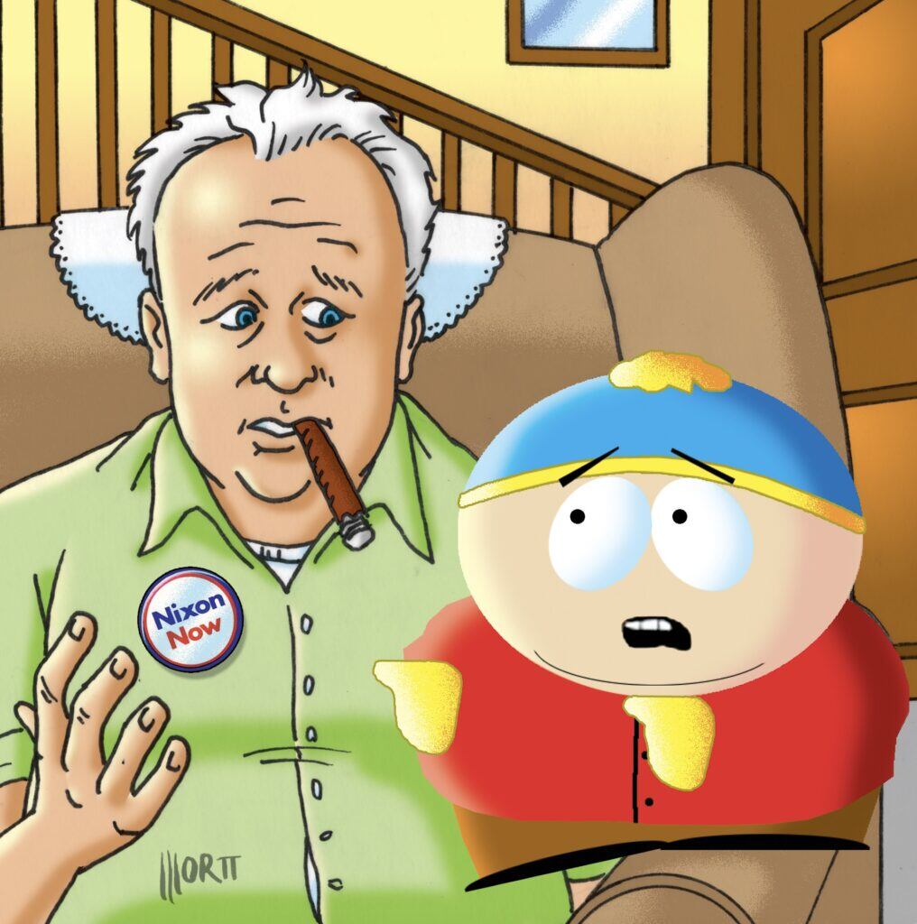 Stan, a natural skeptic in a blue bobble hat, is loosely based on Parker, while his best friend, Kyle, a Jewish kid with a strong moral sense and a tendency towards impatience and irritability, is loosely based on Stone. Kenny, whose voice is unintelligibly muffled by his orange parka, is poor and spends the first couple of seasons dying every week. (“Oh my God, they killed Kenny!” “You bastards!”) Cartman, meanwhile, is more similar to Archie Bunker, the bigoted patriarch of 1970s sitcom All in the Family, than anyone behind the scenes. Archie Bunker was racist, antisemitic, homophobic, and nostalgic for, of all things, the Hoover administration. When Norman Lear created All in the Family, it was “designed to explode the medium’s taboos,” Emily Nussbaum writes. He “wanted his shows to be funny, … but he also wanted to purge prejudice by exposing it.” It was a slackwire act that had CBS airing the show with this “nervous disclaimer”: