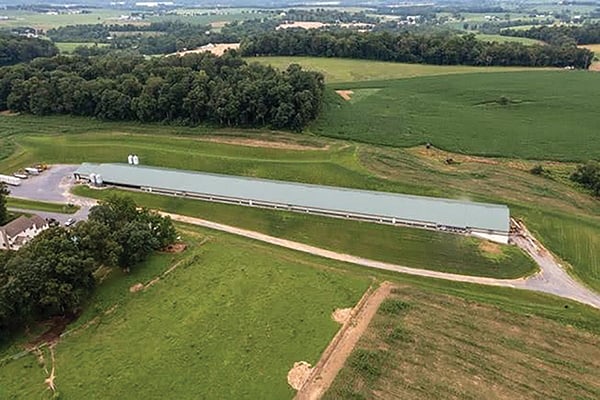 Above: The east side of a chicken house on a multi-building industrial egg-production farm. This company markets its eggs as laid by “Free Roaming” hens, but on this farm, no outdoor access is apparent. Pennsylvania, USA, 2023. Gregory Kemp / Animal Outlook / We Animals