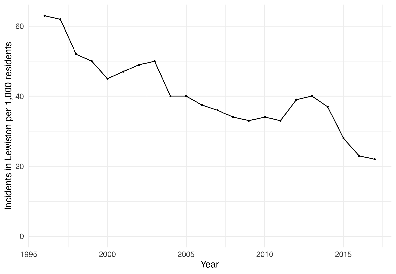 Figure 3: Criminal incidents in Lewiston, Maine. Data-source: Maine State Police crime reports, 1996-2016.