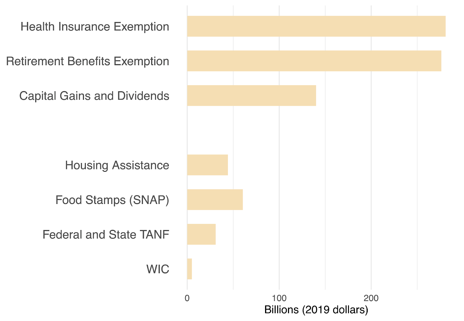 Figure 4: Three tax expenditures compared to selected welfare programs in FY2019. Source: Congressional Budget Office (2019).