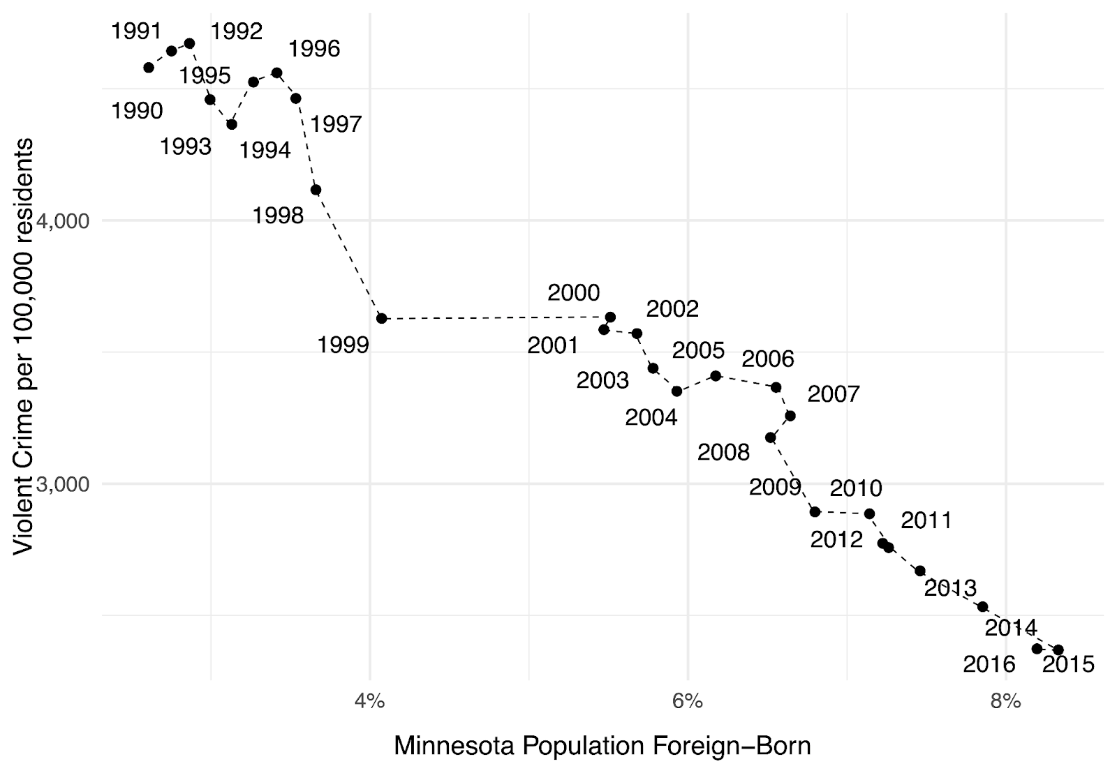 The first place to look, then, might be highly aggregated time trends. Has Minnesota become more violent since opening its doors to Somalis? No, crime rates are falling. In 2024, Minnesota crime rates were at a 60-year low. In 2025, Minneapolis recorded “50 fewer shootings, nine fewer homicides, and a third fewer carjackings and other robberies” compared to the year prior. The state gets safer every decade, even as it records more newcomers than ever. Here is Minnesota’s crime rate and foreign-born population from 1990 to 2016, the last year before Trump’s Muslim Ban ended Somali immigration:
