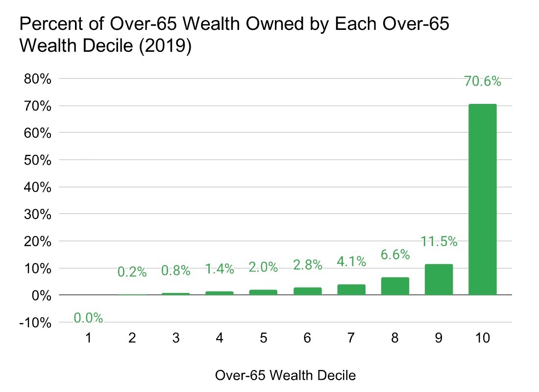 The word “proxy” captures a lot of my disagreement with Moyn’s position. He’s targeting age because age is correlated with wealth, and correlated with power, and correlated with decline. But age is being used as a kind of stand-in for those things, when really we should be targeting the things themselves. The problem is concentrated wealth, not age, and while it may be true that older Americans hold more wealth in the aggregate, to talk that way suggests that old people as a group are rich, even though, as Matt Bruenig notes, statistics on old people being more wealthy “obscure the substantial inequality that exists within each age group” because most of that wealth is owned by the top 10 percent of older people: