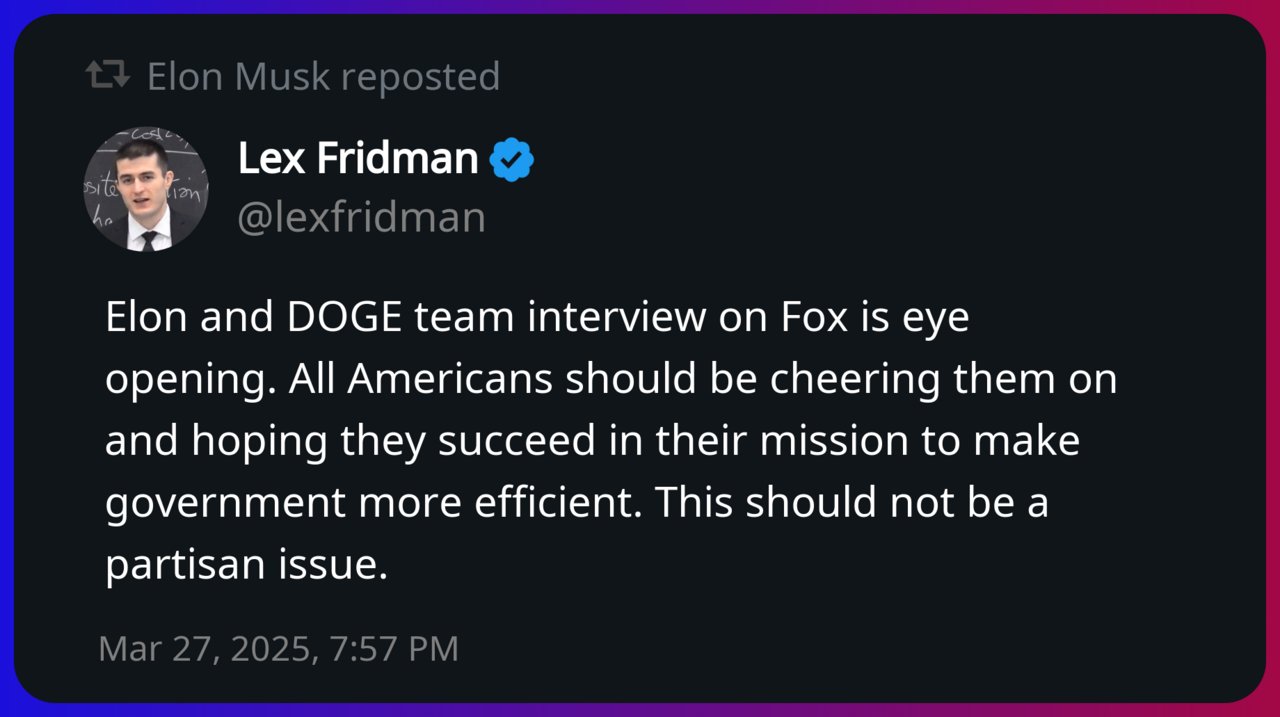 Fridman eventually deleted his foolishly naive post. Perhaps someone educated him on the actual work DOGE is doing, and the fact that Republicans do not actually want a government that functions like an Apple store. They want a government that doesn’t provide public services, that leaves corporations in charge of the country. The right has a very clear agenda and it is horrifying: it’s a Social Darwinist dystopia where the poor and disabled are left to their fates while plutocrats pillage the country’s wealth. It’s a brainless Spartan state where people are raised to pray, work, and go to war. As this horror is slowly built, we will hear a lot of propaganda about efficiency and liberty. Don’t be naive like Lex Fridman. See things for what they are, and do not be tricked into thinking the world’s richest man is on your side.