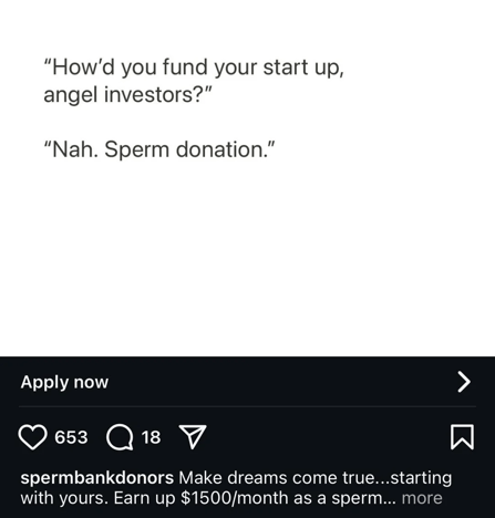 The flyers and pamphlets passed out to prospective donors in the past have been transformed into algorithmic, targeted ads to young men. They’re appearing on all apps—Instagram, TikTok, etc. Some modern campaigns have played into masculine stereotypes of the “manosphere”. One Redditor noted an especially egregious Instagram ad that appeared to be trying to attract tech entrepreneurs by suggesting they donate sperm to help launch their start-up, instead of hoping for angel investors. These ads serve as a reminder that both the donors and the fertility clinics aren’t just doing this for altruistic reasons—it’s for a profit on both ends. Any consideration for the fact that a “donation” (really a sale) will result in the creation of multiple human lives seems to be completely forgotten in this kind of ad.