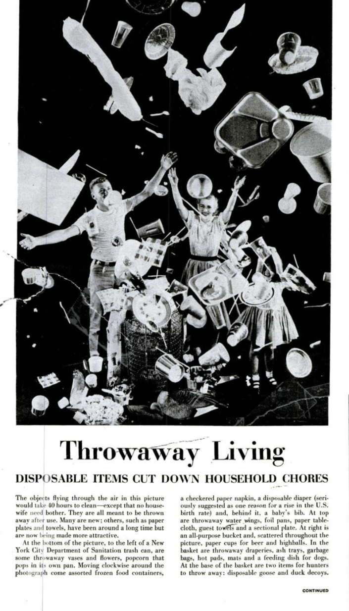 A 1955 Life article dubbed this the era of “Throwaway Living.” A full-page photograph in the magazine features a grinning, white-bread American family beneath a flurry of disposable items: frozen food containers, paper napkins, diapers, foil pans, paper cups, and more. “These objects flying through the air in this picture would take 40 hours to clean—except no housewife need bother,” the page reads. “They are all meant to be thrown away after use. Many are new; others, such as paper plates and towels, have been around a long time, but are now being made more attractive.”