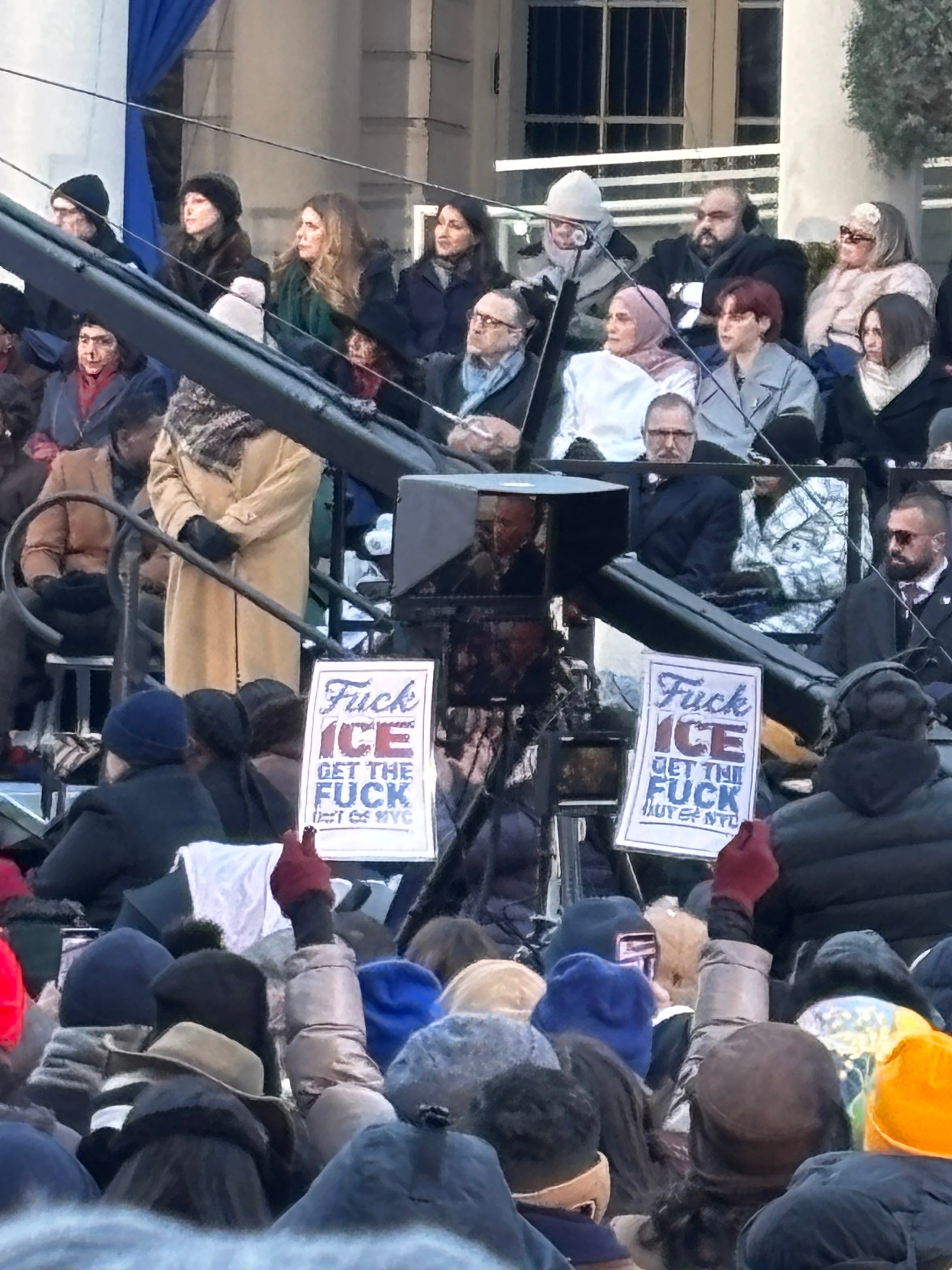 Before Mamdani could even reach the podium, those who elected him make clear their positions. Someone in the crowd holds up a large “Fuck ICE” sign, and for almost the entirety of the inauguration, another attendee holds an image of Hind Rajab—the five-year-old girl who was murdered by Israeli forces in Gaza in 2024—high in the air, where the cameras could see it. It’s a potent reminder of the literal life-and-death stakes of the Palestine issue. Mahmoud Khalil, the Columbia graduate student who was abducted by ICE for his activism, is also in attendance, along with numerous other young activists in keffiyehs and clothing bearing the Palestinian flag. None of them will allow Mamdani to forget the commitments he’s made.