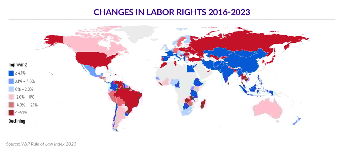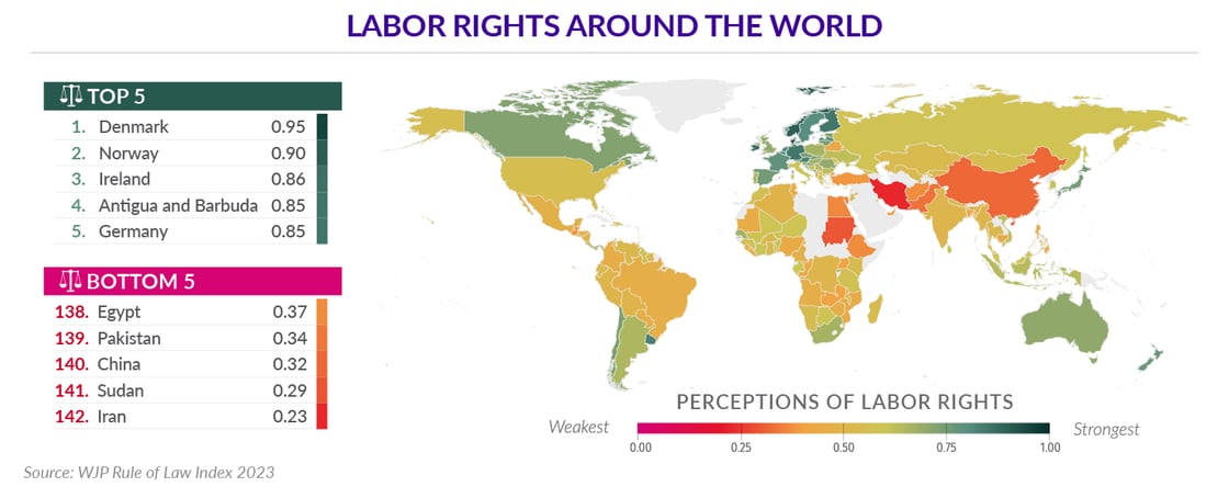 In April, the World Justice Project published a report comparing labor rights in 142 countries around the world. It is part of a broader examination of “fundamental human rights” worldwide, which the Project found “have been declining since 2016.” However, they said “Labor rights is the exception.” Some of the biggest improvements have occurred in Grenada, Pakistan, India, Botswana, and North Macedonia.